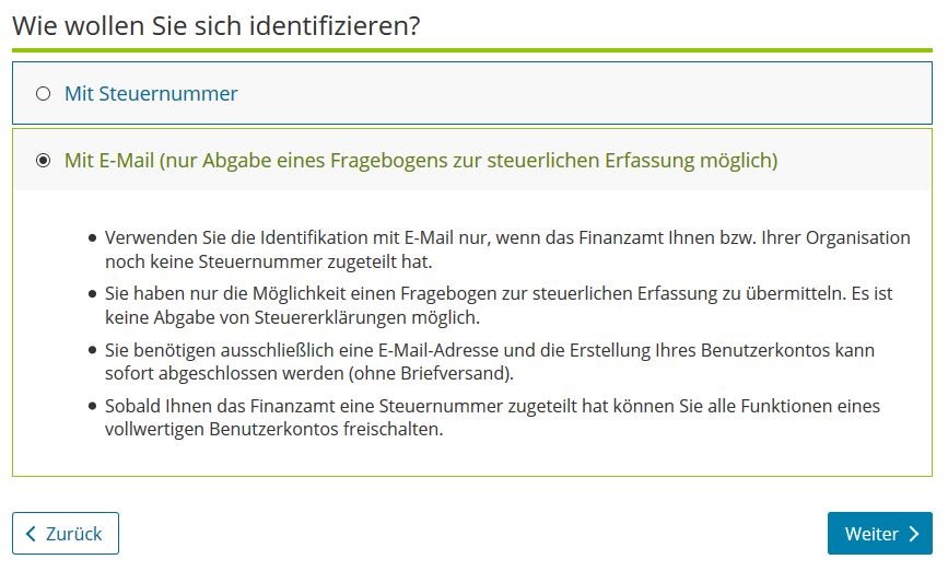 Neu ab 2021: Elektronische Übermittlung des Fragebogens zur steuerlichen Erfassung - Registrierung mit E-Mail