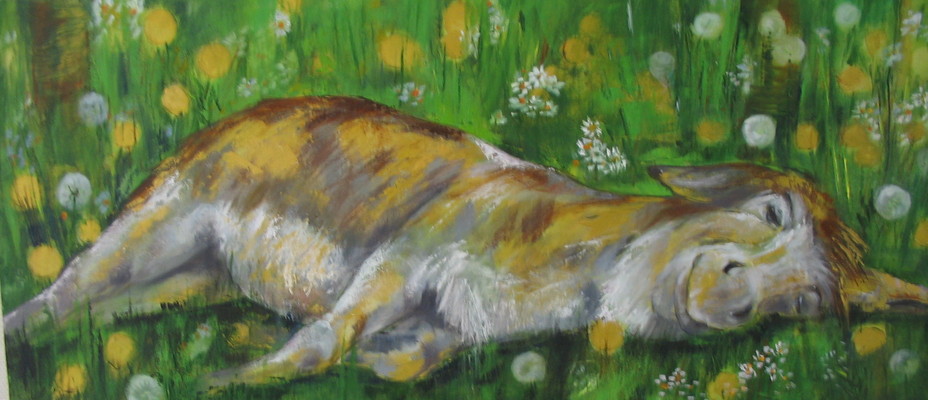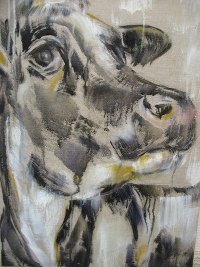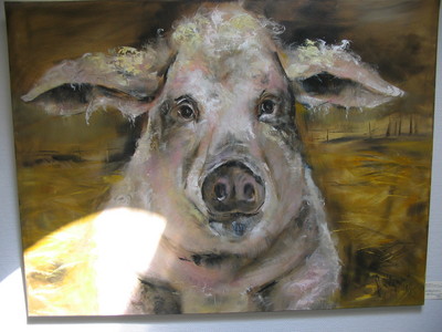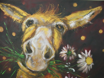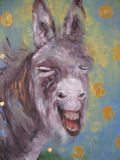 Die Goldenen Esel sind bereits beim Frühstück ein Garant für gute Laune, positives Denken und Optimismus – er begleitet, fordert geradezu die Auseinandersetzung – und sei es mit sich selbst. Emil, temperamentvoll, eigensinnig und sich immer wieder neu erfindend, und so sind auch die Bilder der Künstlerin. Sie betrachtet Emil als laufende Herausforderung und setzt Erlebtes und Gesehenes mit gleichem Temperament um. Und gemäß diesem Temperament sind die Bilder häufig als großformatige Arbeiten angelegt.